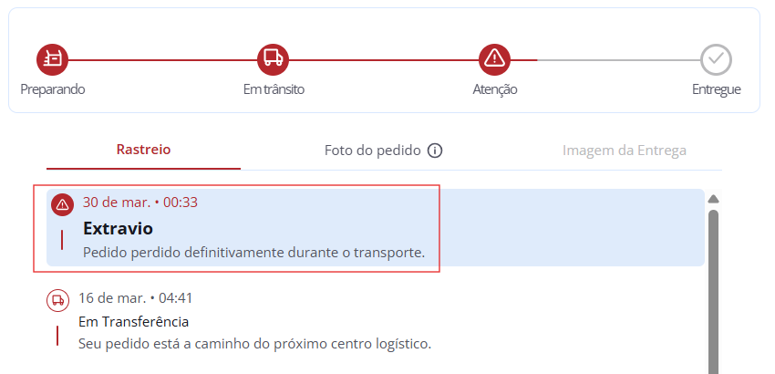 "Identificamos que, infelizmente, houve um extravio com o seu pedido durante o processo de transporte. Isso significa que, mesmo após todas as verificações e buscas realizadas pela transportadora, o pacote não foi localizado.