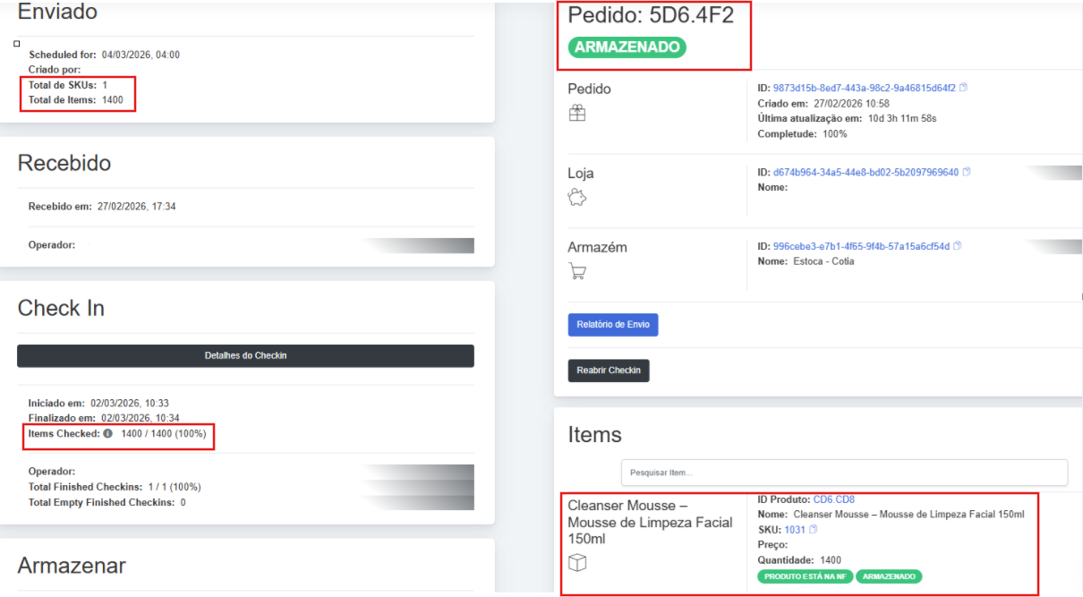 Durante o check-in, nossa equipe abre as caixas recebidas, realiza a conferência, identifica a integridade dos produtos e os SKUs para iniciar o processo de registro e rastreamento de cada peça.
