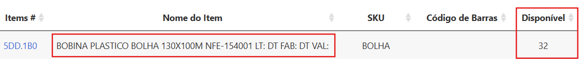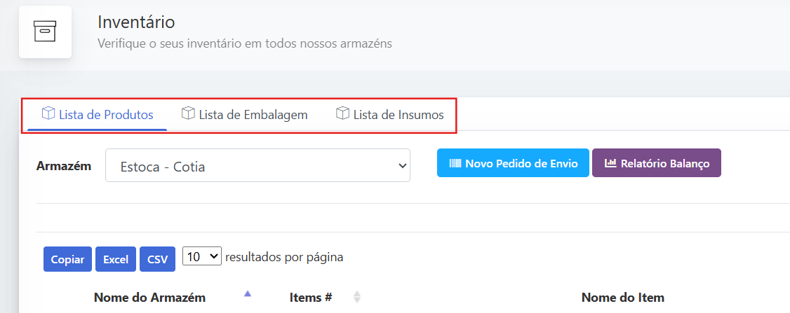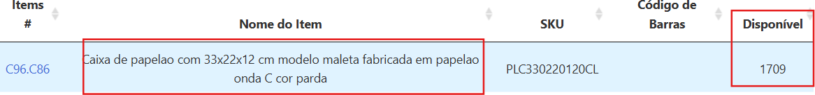 Em "lista de embalagem" temos todas as embalagens disponíveis de sua marca, também sendo possível verificar a quantidade disponível dos itens.