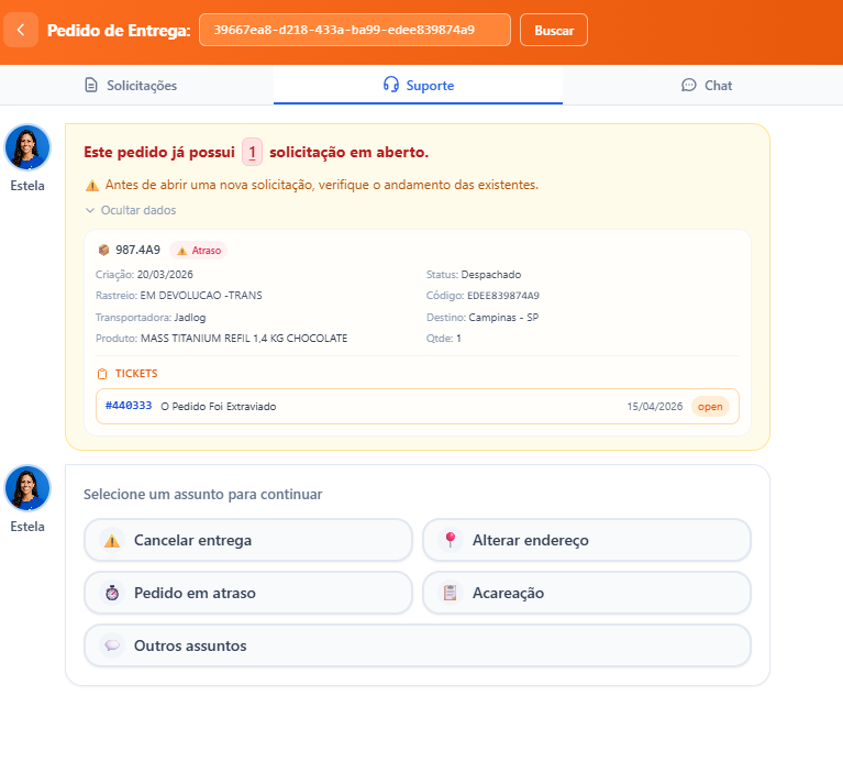 Ao inserir o dado no formulário, se por acaso já houver um atendimento em andamento sobre o mesmo pedido, você será comunicado: