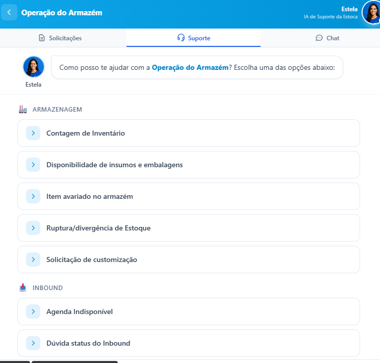 ➡️Se você precisar falar sobre operação do armazém ou plataforma e sistema basta clicar no botão inicial e ele abririrá vários substatus para que você encontre a melhor classificação e prossiga com a abertura do chamado.