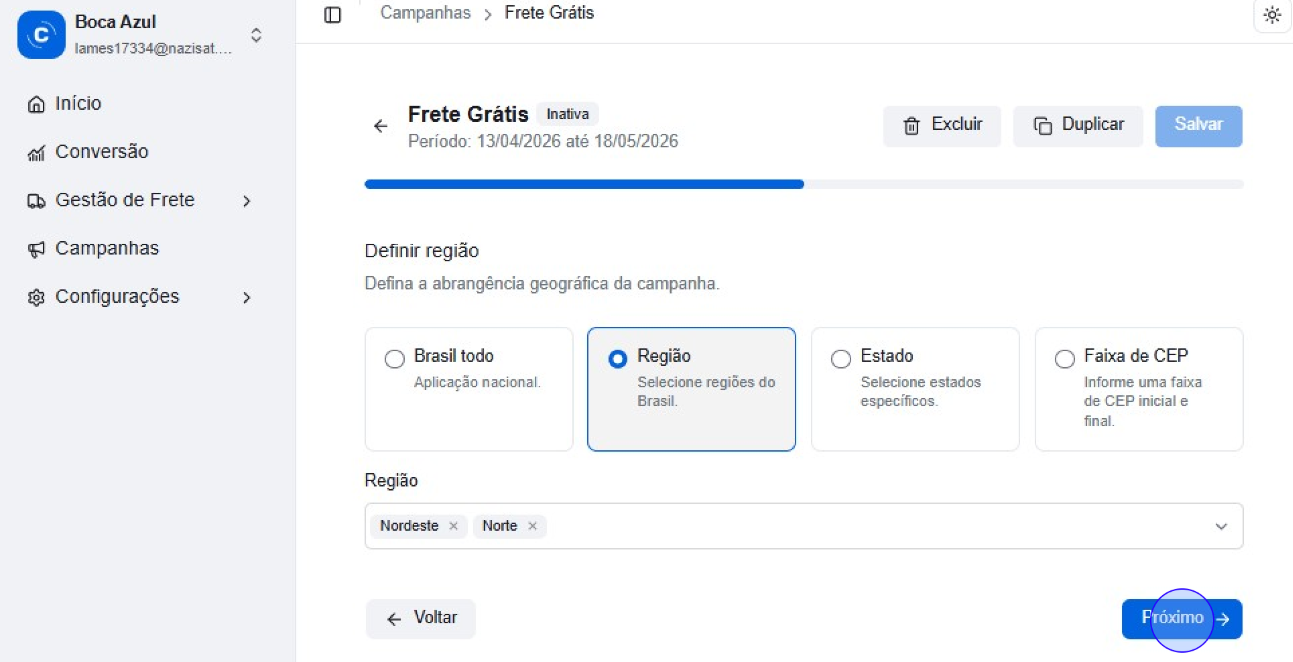 | ⚠️Atenção a conflitos: Se você tiver outra campanha ativa com uma regra sobreposta (ex: uma campanha para o Nordeste e outra para o estado da Bahia ao mesmo tempo), isso pode gerar conflito e impedir que ambas funcionem. Sempre revise as campanhas ativas antes de salvar. |