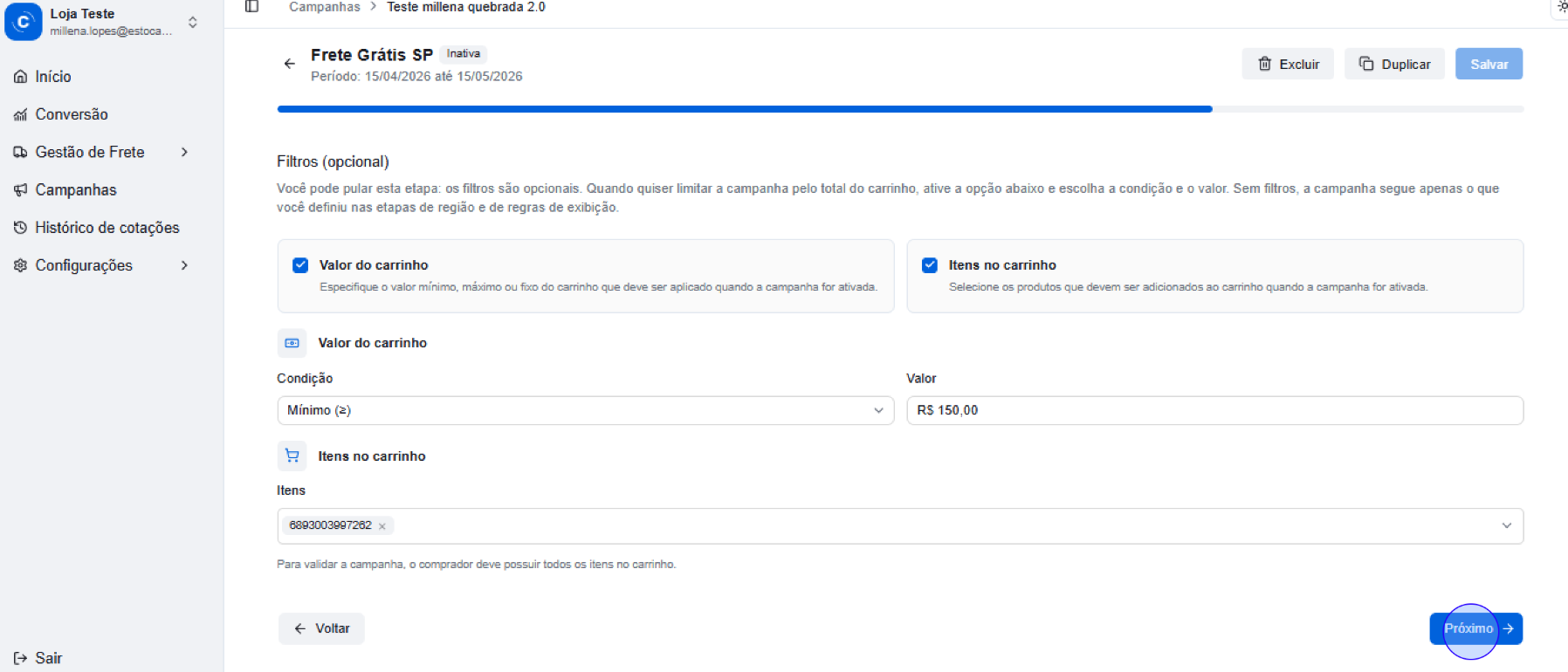 → Itens do carrinho: Permite especificar produtos que devem estar presentes no carrinho para que a regra de frete seja aplicada.