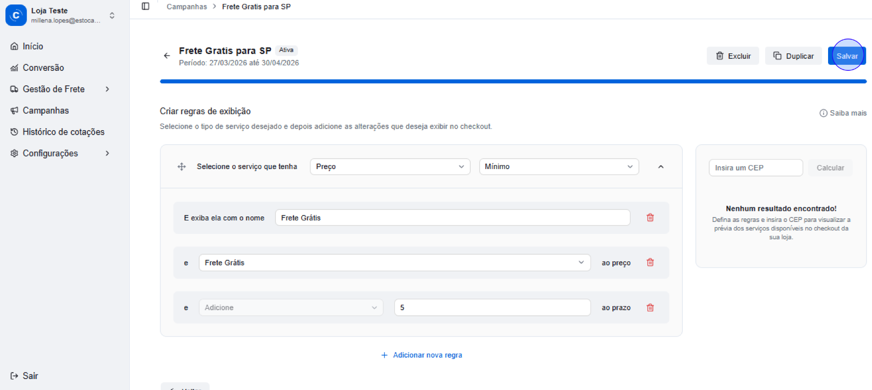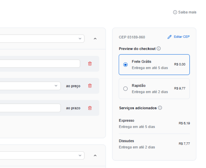 Na etapa de regras, um painel de preview aparece à direita da tela. Ele mostra em tempo real como os serviços de frete aparecerão no checkout do cliente após as regras serem aplicadas.