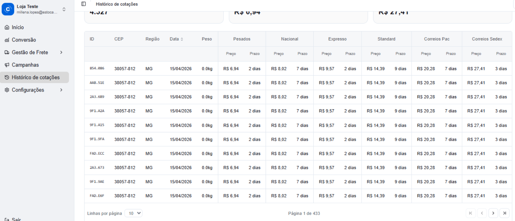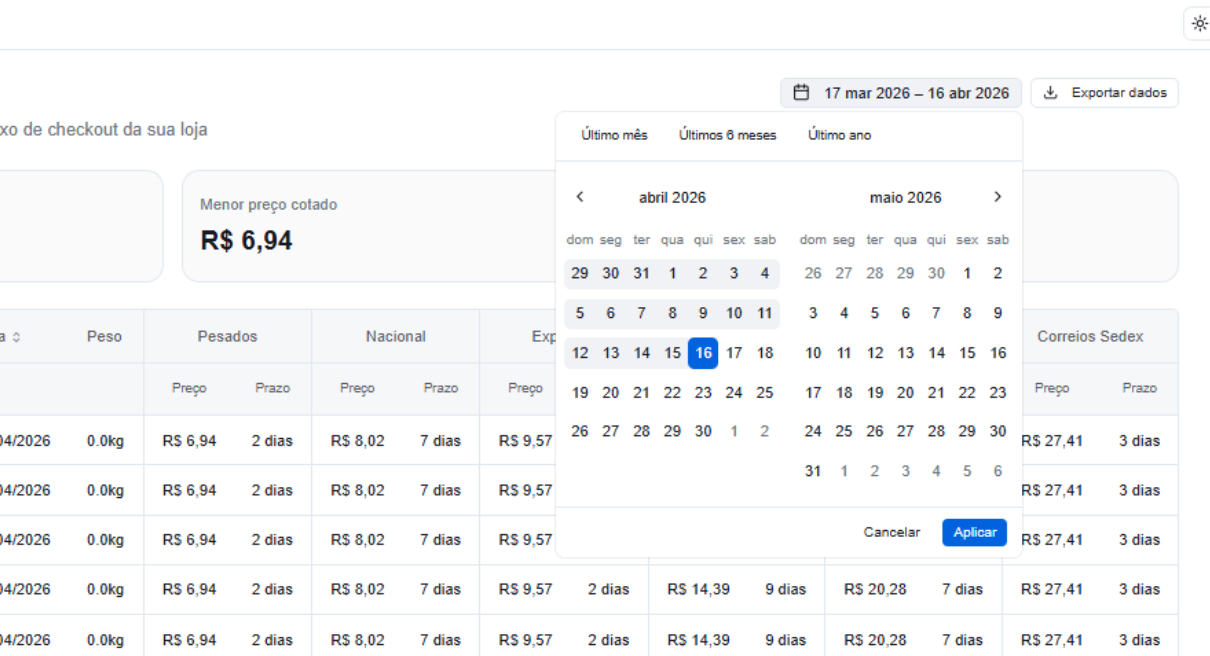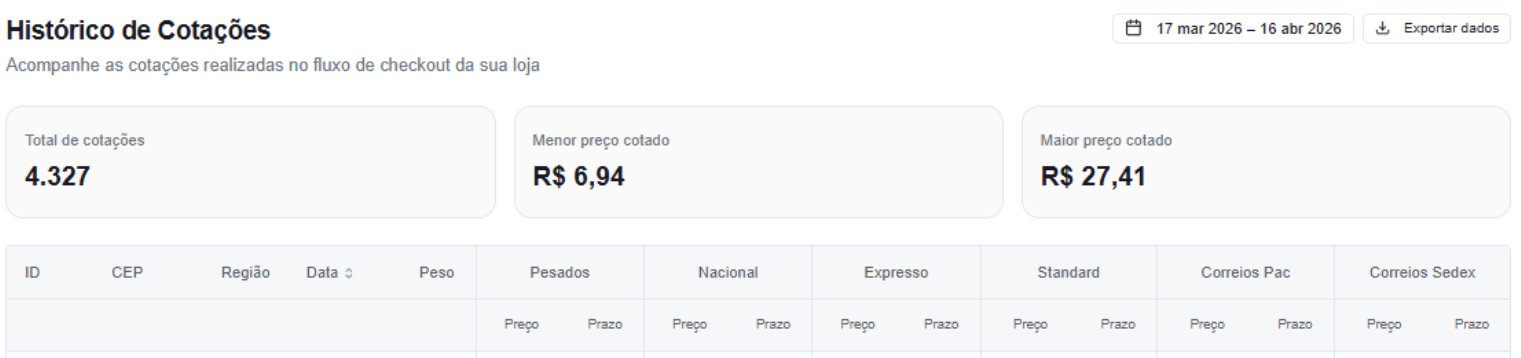 📈O histórico de cotações registra todas as consultas de frete realizadas no checkout da sua loja. Use esta página para analisar o volume de cotações, faixas de preço e detalhes de cada consulta.