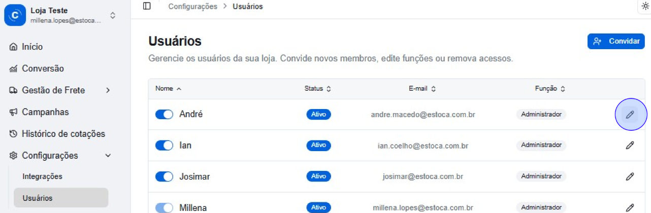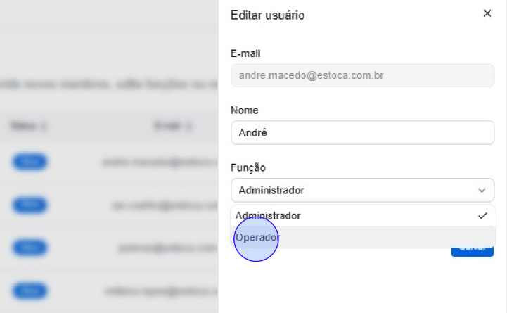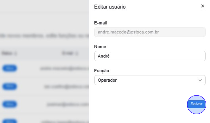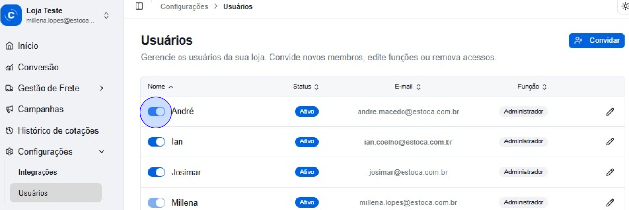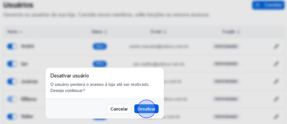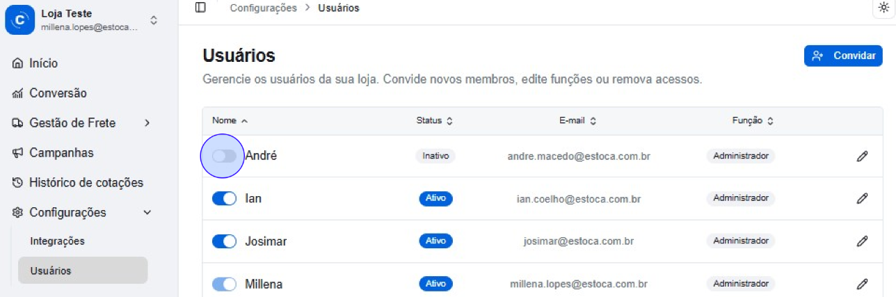 ⚠️Atenção: O e-mail não pode ser alterado. Se o e-mail do usuário for alterado, desative o acesso atual e envie um novo convite para o endereço atualizado.
